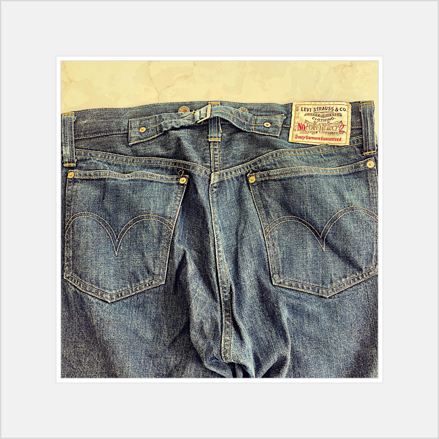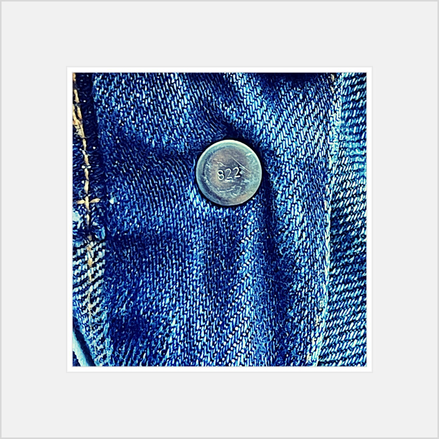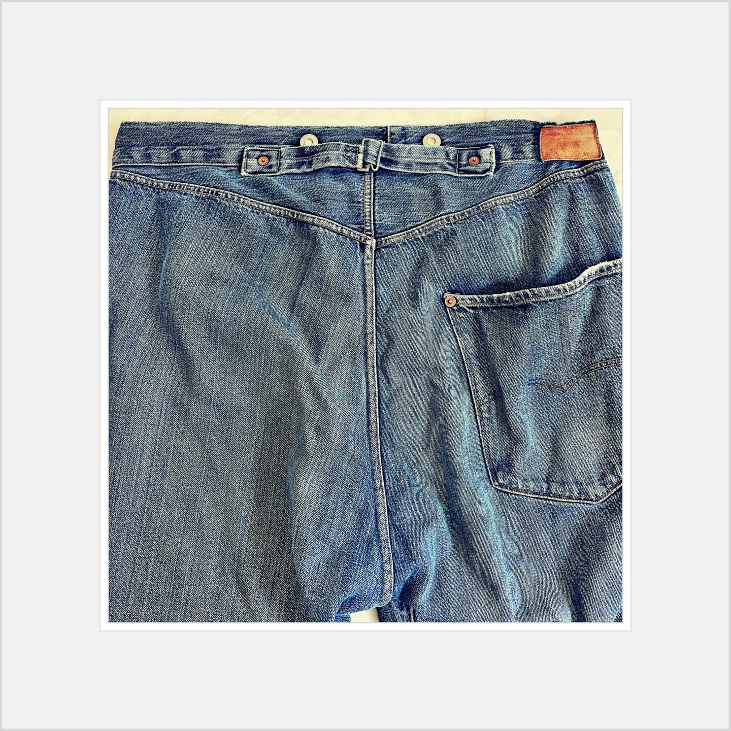 Now to the enigma: a pair with a single back pocket, exposed rivets, cinch back, and an 822-stamped fly button — which points to Levi’s now-closed Valencia Street factory. If you know, you know.